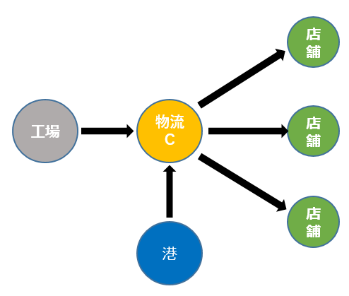 一方で、上図においてリンクの結節点となる物流拠点(丸の図)をノードと呼ぶ。